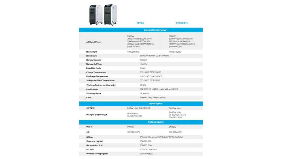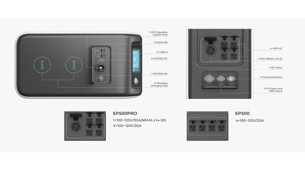 The BLUETTI EP500 is shipped with a ground-breaking 5100Wh LiFePO4 battery pack and a 2000W rated (3000W for the EP500 Pro) pure sine wave AC inverter. This class-leading power station brings you the power to run your entire party, family camping trip, cabin workshops, or even your whole house for a day or two in the event of an unexpected outage. Up to 15 outlet sources allow you to power anything from laptops and air conditioners to your electric vehicles without breaking a sweat.![]()