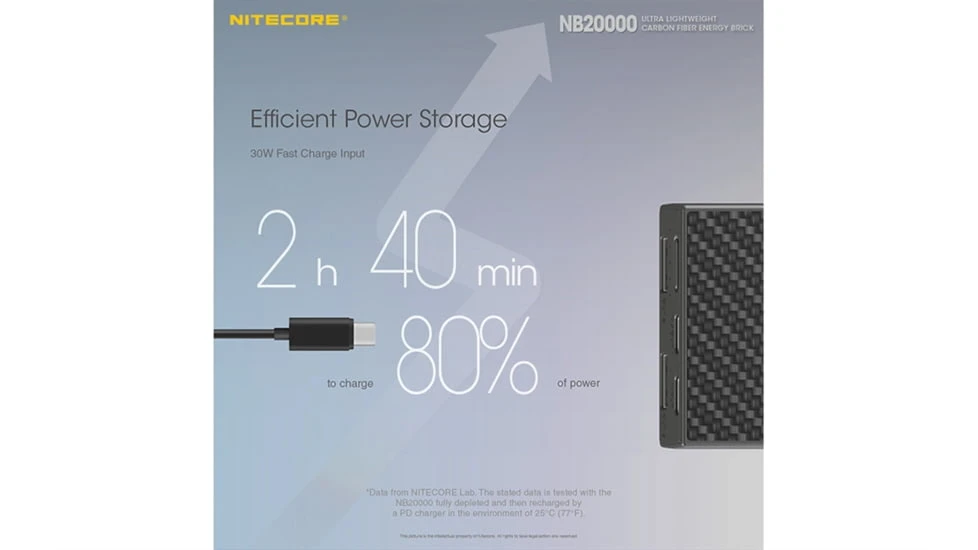 You electronics just got a new best friend! The Nitecore NB20000 power bank has an extraordinary 20,000mAh battery that can charge an iPhone 12 six times over! Embodying all this power in a solid carbon fiber frame and case, the NB20K is 27% lighter than conventional power banks, and compact enough to slip right into your pocket, with a sleek modern minimalist design. The NB20k is the ultimate portable backup battery charger for road warriors, outdoor enthusiasts who enjoy hiking or camping, or first responders who are on a long search and rescue mission. It is also a great additional to your emergency prep kit or bug-out-bag. NB20k is packed with features that puts it way ahead of the pack. Its 3x USB/USB-C QC output ports are compatible with a variety of electronics and allow you to fast charge electronics. The USB-C output port has been upgraded to 45W making this the ultimate laptop/notebook companion charger. For delicate devices such as bluetooth headphones and smart watches, NB20k has a one-touch low current mode. Its lightweight yet strong carbon fiber case ensures that NB20k is highly resistant to puncture, abrasion, and impact. Additionally, the NB20k is IPX5 rated water resistant, and provides safeguards against short-circuit, overcharge, over-discharge, and overheat.![]()